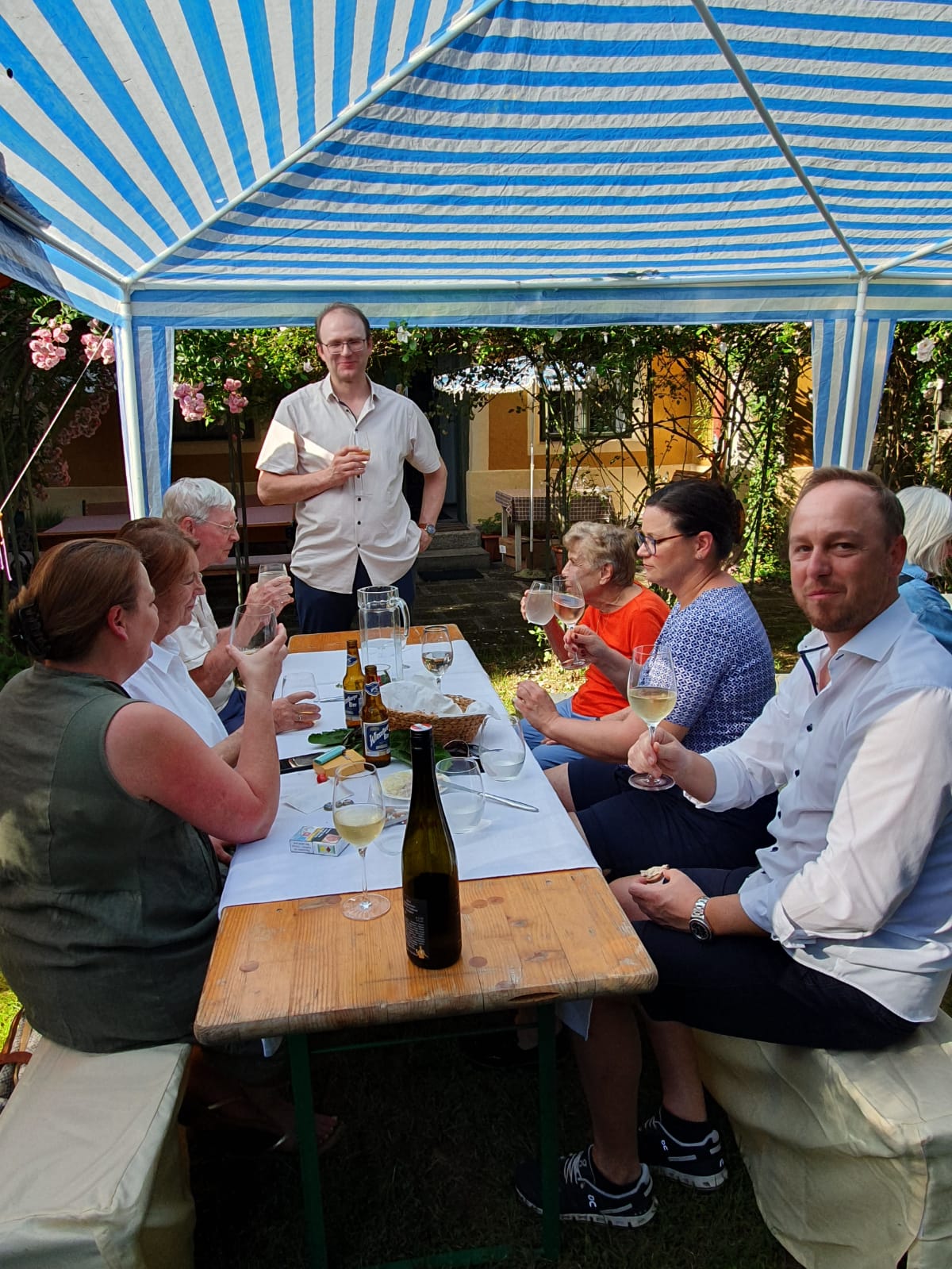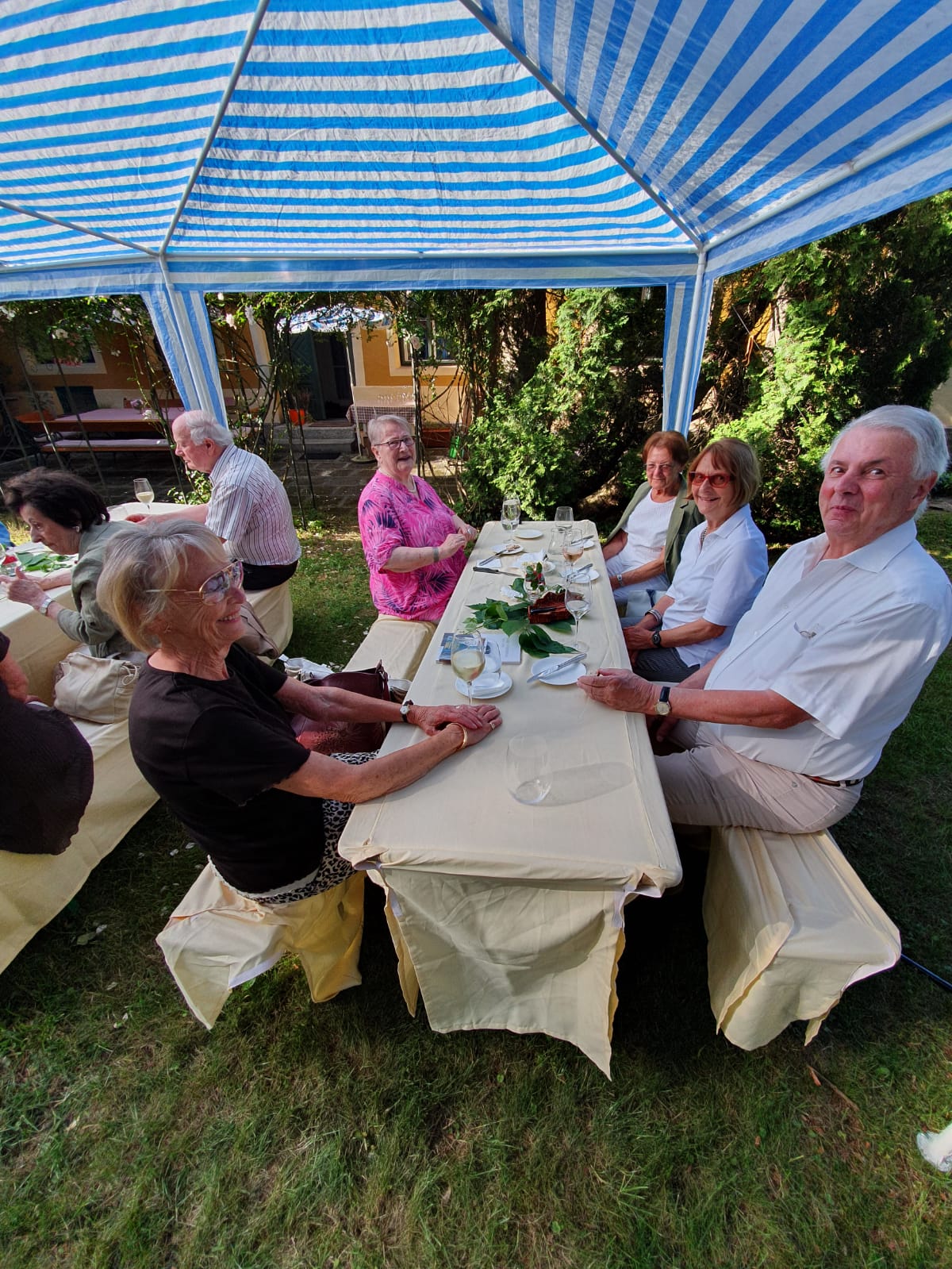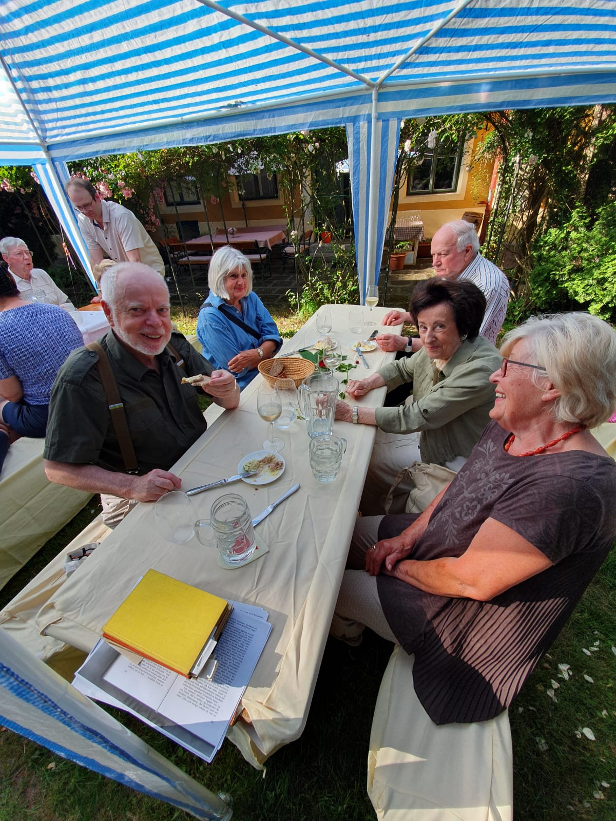 Frau Brigitte Weinheber-Janota und der Präsident der Josef Weinheber-Gesellschaft, Dr. Christoph Fackelmann, führten die Besucher durch die im Originalzustand erhaltenen Räumlichkeiten, präsentierten die Bildersammlung mit den vielen Weinheber-Originalen und stellten die Bibliothek des Dichters und die ihm gewidmete kleine Museumsschau vor. Danach begab man sich zur denkmalgeschützten Grabstätte Weinhebers, um den Empfang schließlich in einem von der Familie gastfreundlich gestalteten Beisammensein bei rustikalem Speis und Trank auf der Terrasse vor dem Landhaus ausklingen zu lassen. Die lebhaften Gespräche an dem mit sonnigem Wetter gesegneten Tag waren von der gemeinsamen Hinwendung zum Geist des Hauses, der Kunst Josef Weinhebers, getragen. Auch das Andenken Christian Weinheber-Janotas, des vor vier Jahren verstorbenen Dichtersohnes, war spürbar. Gemeinsam war die Freude, nach den langen Monaten des gesundheitspolitisch bedingten kulturellen und gesellschaftlichen Stillstands wieder zu Gespräch und Austausch zusammenfinden zu können.
